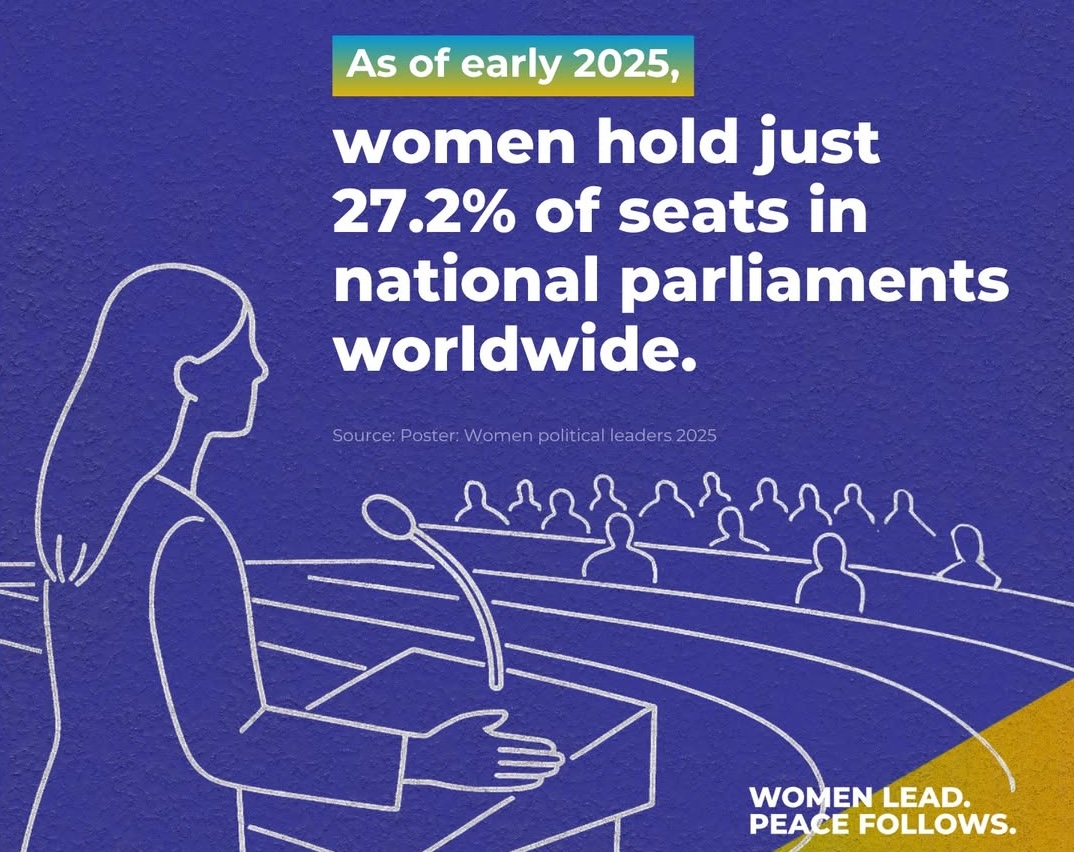 Цей постер показує дані про жінок на керівних посадах виконавчої влади, зокрема про глав держав, глав урядів і членкинь урядів, які очолюють міністерства. Дані станом на 1 січня 2025 року свідчать про стале недопредставлення жінок у виконавчому лідерстві в усьому світі, що підкреслює: гендерного паритету досі не досягнуто.